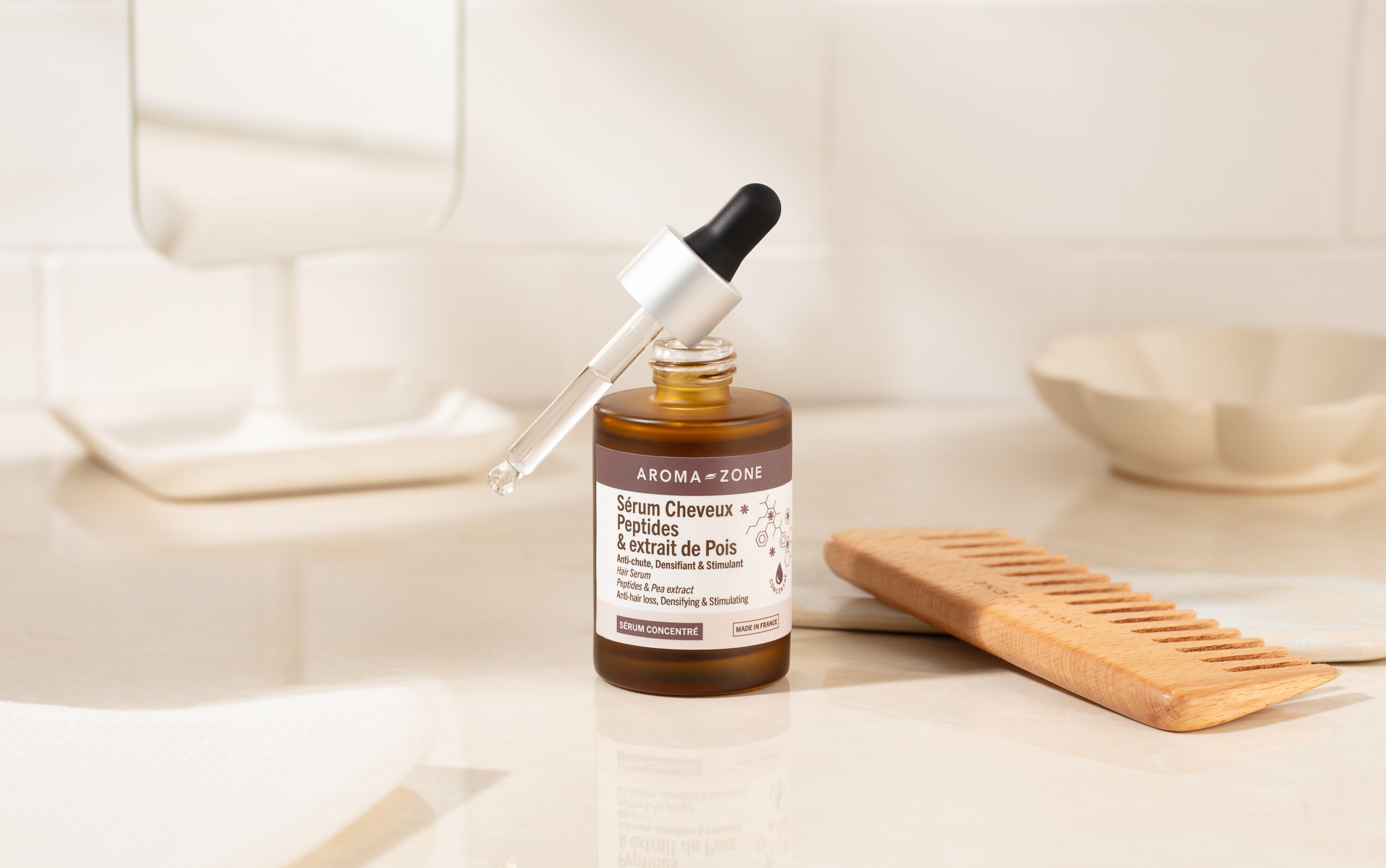 Aroma-Zone ha poi creato un siero a base di Peptidi ed estratto di pisello per capelli danneggiati, fragili e senza volume. Grazie ai suoi ingredienti naturali, come i Peptidi, l’estratto di Pisello, l’estratto di trifoglio rosso e il Pantenolo, questo prodotto, adatto a tutti i tipi di capelli, stimola la crescita dei capelli e ne riequilibra il ciclo di vita. Il risultato è una chioma più folta, capelli più lunghi, spessi e più forti. Facile e rapido da utilizzare senza risciacquo, aiuta anche a ridurre la produzione di DHT (dihlydrotestosterone), il principale fattore responsabile delle calvizie, e la caduta di capelli occasionale causata da stress, cambiamenti di stagione, squilibri ormonali o carenze alimentari.